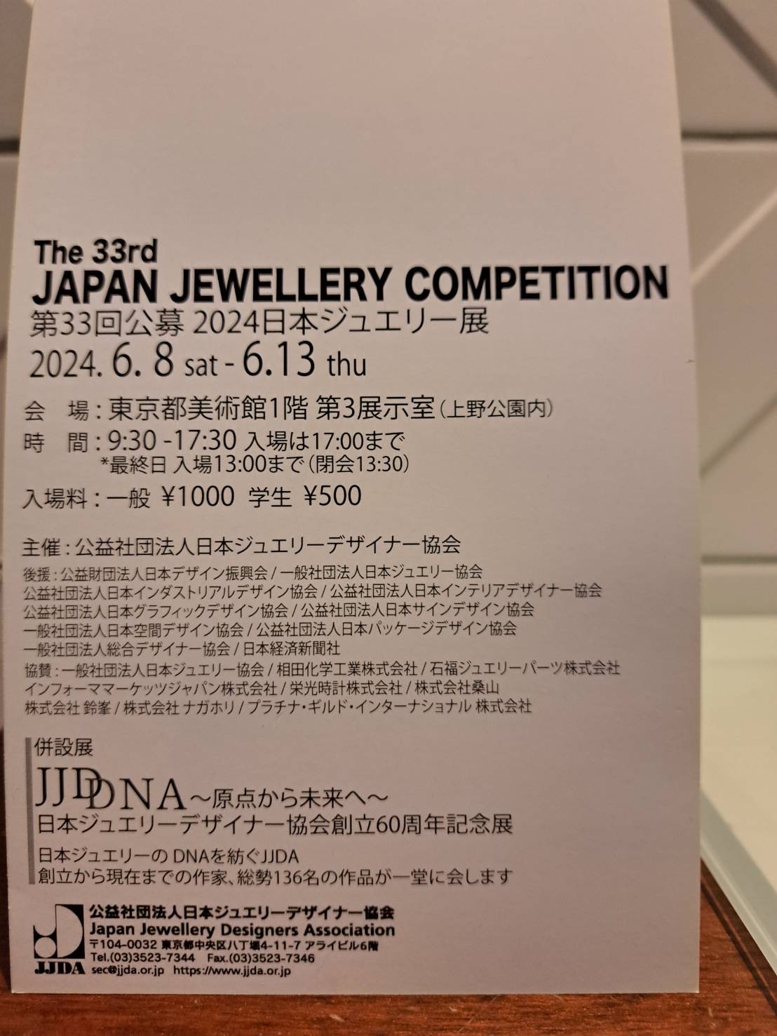 2024日本ジュエリー展 出展のお知らせ 2024年05月30日 日時:2024年6月8日(土)~13日(木) 会場:東京都美術館1階 第3展示室(上野公園内) 第33回公募 2024日本ジュエリー展 ぜひ足をお運びください。
